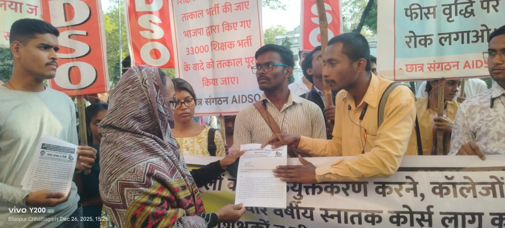 इन्ही तमाम गंभीर समस्याओं को देखते हुए हमारे देश के आजादी आंदोलन के महान क्रान्तिकारी शिवदास घोष ने 28 दिसम्बर 1954 को देश में क्रांतिकारी छात्र संगठन ऑल इंडिया डेमोक्रेटिक स्टूडेंट्स ऑर्गेनाईजेशन AIDSO की नींव रखी थी। अपने स्थापना काल से ही छात्र संगठन AIDSO सर्वसुलभ, वैज्ञानिक एव लोकतांत्रिक शिक्षा की मांग कर रहा है। इस वर्ष AIDSO के 71 वे स्थापना दिवस के अवसर पर बिलासपुर जिला कमेटी “छात्र सभा” आयोजित कर रही है। हम सभी छात्र छात्राओं, अभिभावकों व शिक्षा प्रेमियों से अपील करते हैं कि इस सभा में जरूर शामिल हों एवं हर सम्भव सहयोग प्रदान करें।
